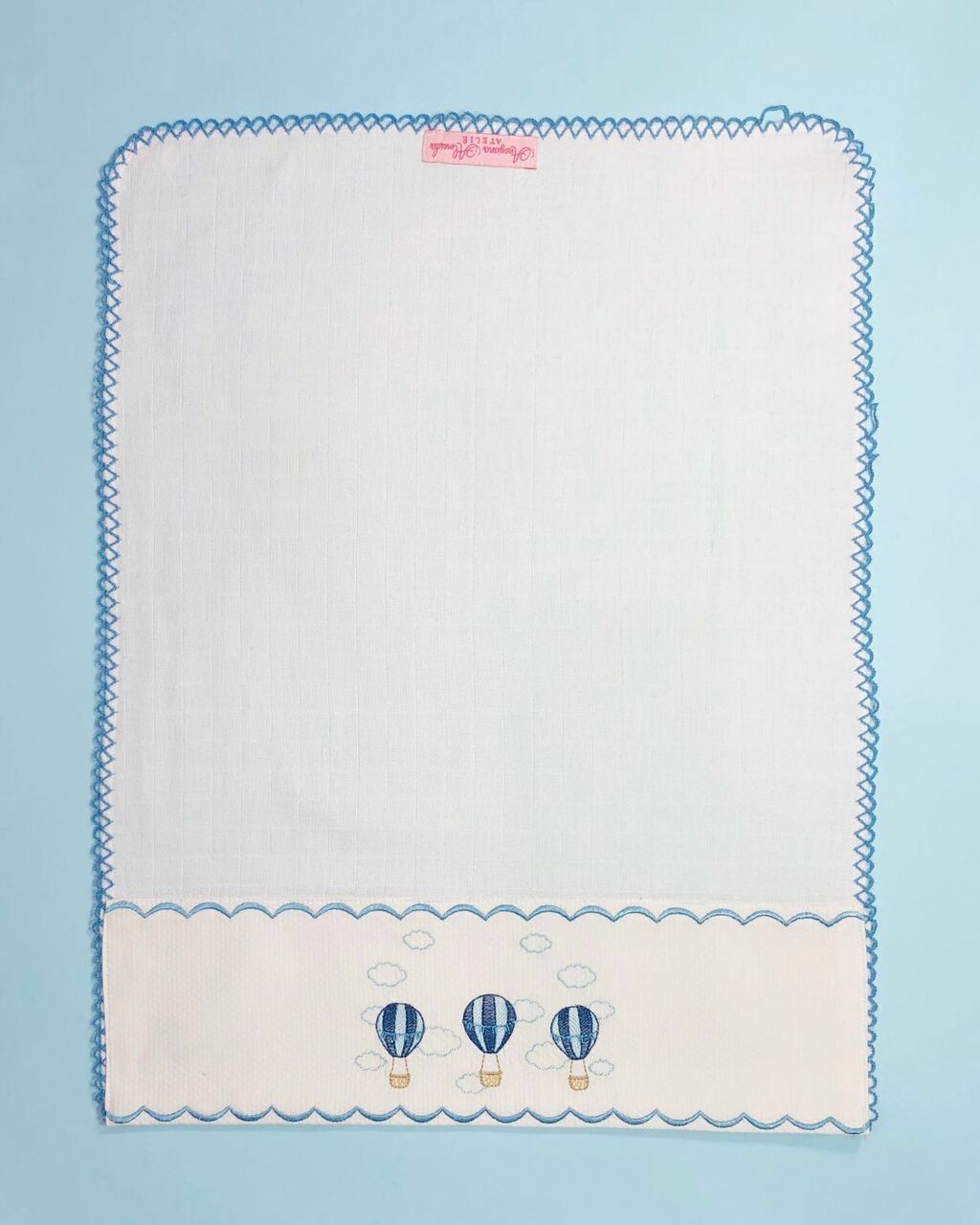 Detalhes que fazem a diferença: - Medidas: Aproximadamente 38 x 50 cm, perfeita para o uso diário. - Bordado encantador: Com bordado de balões e acabamento em picueta, cada fralda é uma verdadeira obra de arte! - Conforto garantido: O bordado é feito em um barrado separado, evitando que o avesso entre em contato com a pele do seu bebê.